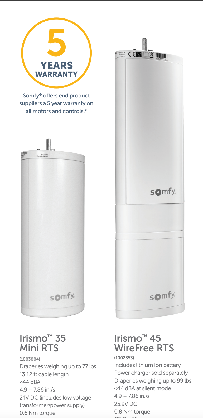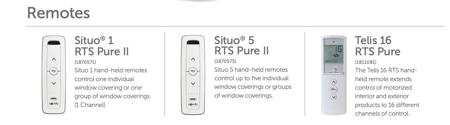 Mini RTS for Draperies weighing up to 77 lbs OR Irismo™ 45 WireFree RTS for Draperies weighing up to 99 lbs. Situo 1 hand-held remote control for one individual window covering or one