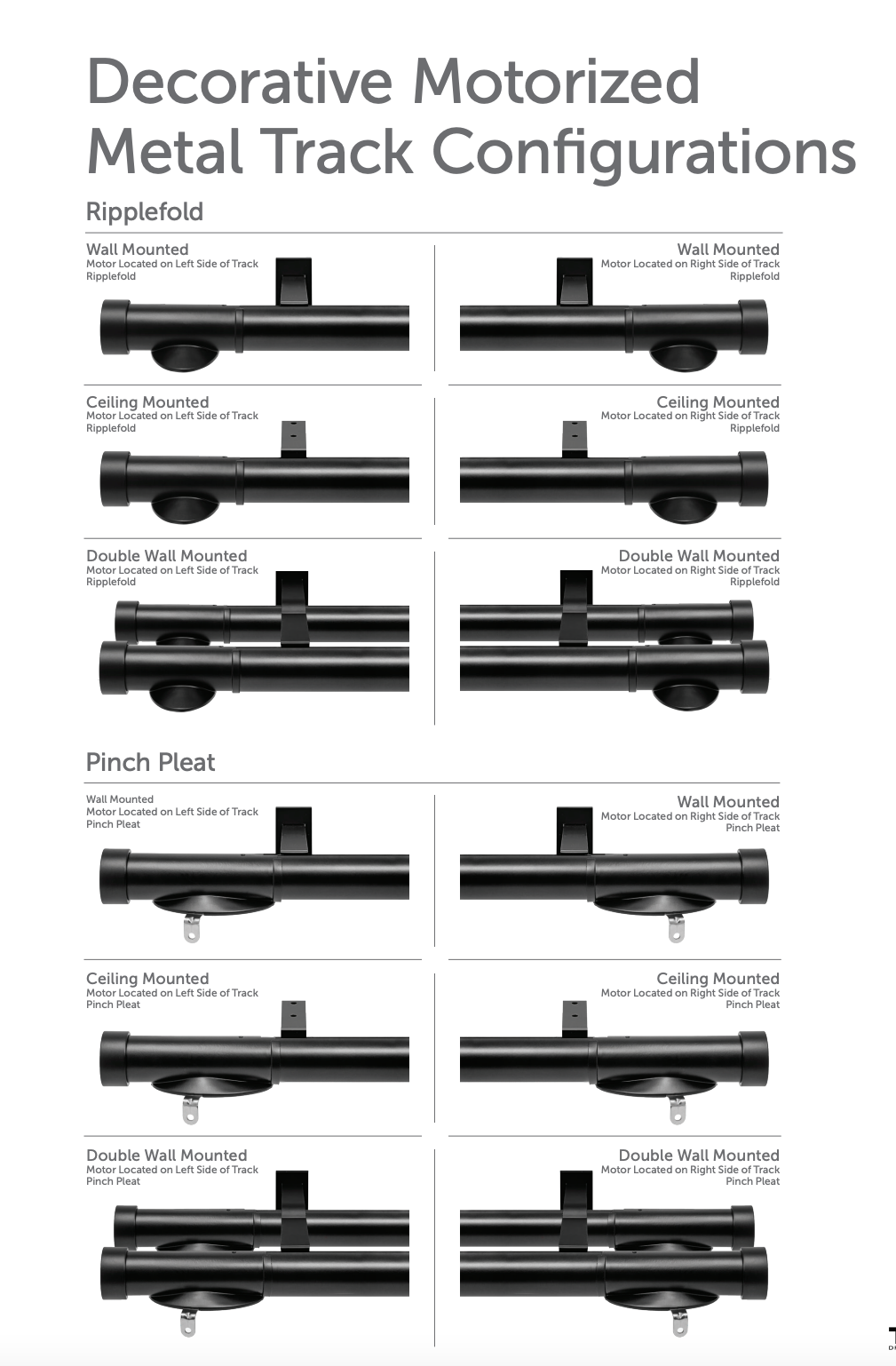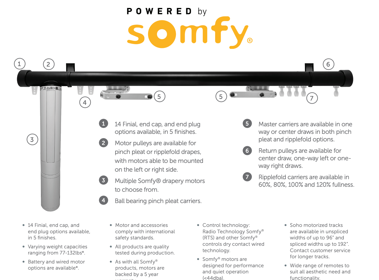 Motorized curtain tracks Powered by Somfy for draperies up to 99lbs. Designer channel rod styles for Pinch Pleat and Ripple Fold Curtains.